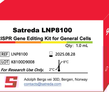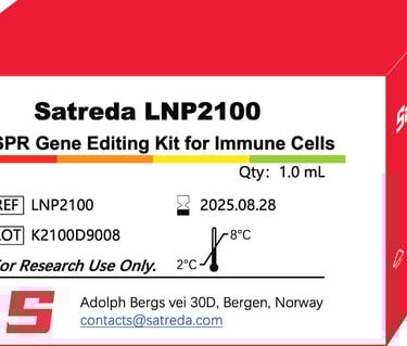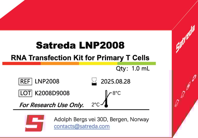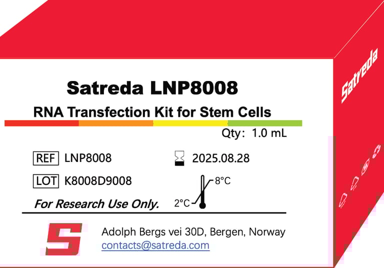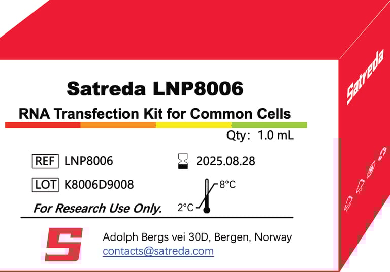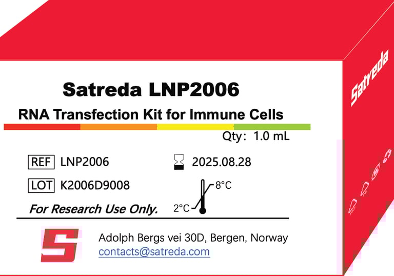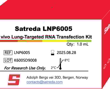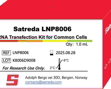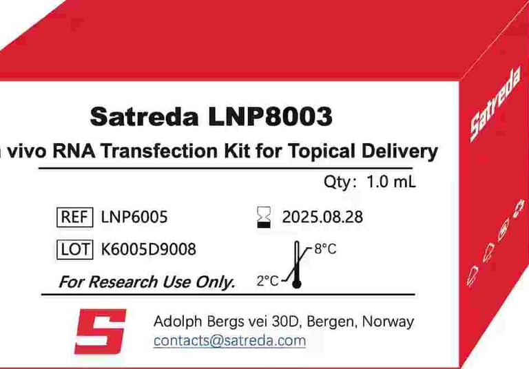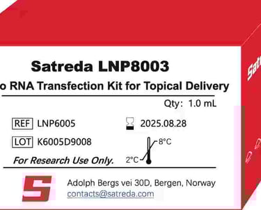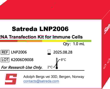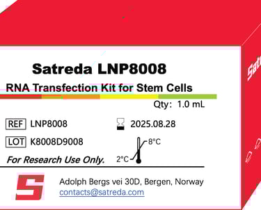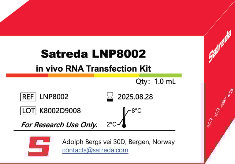 Satreda's LNP product line offers ready-to-use, ethanol-free RNA transfection and delivery kits designed for diverse research needs — from immune cells, stem cells, and primary cells to in vivo systemic and organ-targeted delivery. With cutting-edge pH-responsive lipids, broad RNA compatibility, and ultra-low toxicity, our kits deliver superior efficiency, precision, and flexibility.
