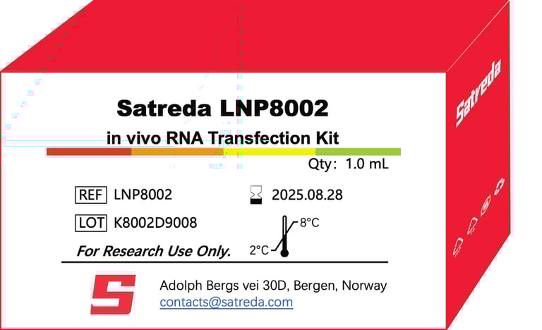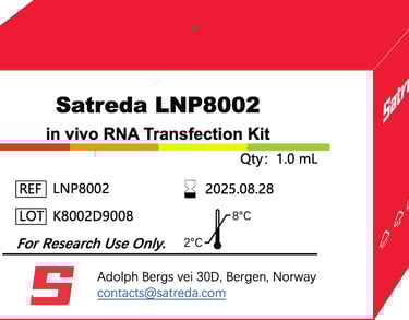 The SatredaLNP™ 8002 is a next-generation solution designed for broad, systemic RNA delivery across multiple tissues and organs. Developed using Satreda’s advanced in vivo LNP technology, LNP8002 integrates precision lipid engineering, optimized formulation chemistry, and customizable targeting ligand design to enable efficient, flexible, and safe RNA transfection in vivo. This kit represents a major leap forward for researchers and pharmaceutical developers seeking to advance RNA-based therapeutics, vaccines, and gene regulation studies.