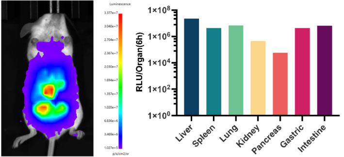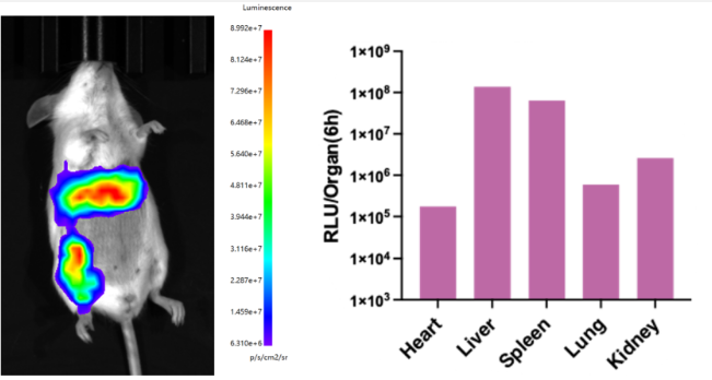 Intraperitoneal injection (IP) of 6 μg Fluc mRNA per mouse. IVIS imaging and tissue distribution analysis were performed 6 hours post-administration.
